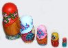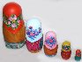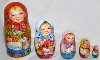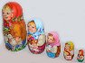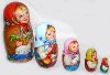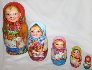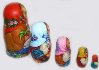 Description: This charming nestling-doll was painted by Lukash A.G. from the town of Sergiev Posad. It includes 5 dolls and each of them depicts children with animals. The first girl and the biggest one hold a basket in her hands and caresses a goat. The second one holds a plate and a spoon, and a rooster is depicted near her. The third girl holds a rabbit, while the fourth one holds chicken. The last and the smallest one holds a cat. Little girls dressed in peasant costumes merrily look at the viewer. Their heads are covered with bright red, blue, pink, and green kerchiefs. They are dressed in multicolored sarafans and white embroidered shirts. Some of them are bare-foot, the others wear "lapti" (bast shoes). The artist does a good job by painting the angelic faces of the little girls. They are animated and show such emotions as joy and playfulness. These nestling dolls don't look like primitive goods owing to the fact that their faces are painted with portrait quality. It seems that real girls are looking at us and laughing merrily. The composition of each doll also includes animals. The nestling doll is made out of wood, and covered with paints.