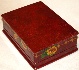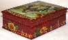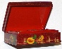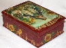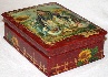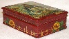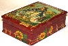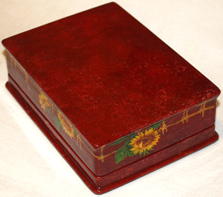 Twigs of a wicker fence painted in oils wrap around the scene as an original frame. The wicker fence and the sunflowers hanging down it, also painted in oils, can be found wrapping around the box's sides. The box's exterior imitates the coloring of red marble (pink veins are scattered against the crimson background); the interior is traditionally red.