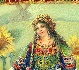 The Old Woman and her geese are painted against the beautiful background filled with the bright sunflowers hanging down the fence. Mother-of-pearl shines through the feathers of both geese, and through a part of the Old Woman's dress.