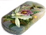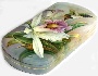 Description: This elegant box is an original creation of the outstanding Fedoskino painter, Oleg Gavrilov. On the box's lid the artist has drawn a hummingbird hovering over the white orchid. The scene is painted against the light green background. The same tone with addition of light blue and pink patches has been chosen for covering the box's exterior. Brilliant pieces of gold metal leaf shine through the hummingbird, and through some leaves of the orchid.