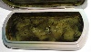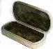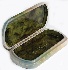 The box's interior imitates the color of green marble (dark green veins and blurry spots are scattered against the olive background). On the box's interior bottom the artist has written his name, and drawn several dew drops. A shining gold metal thread wraps around the box's sides.