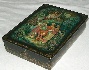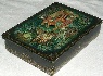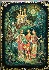 Description: This box is a splendid creation of Yugeniy Dobrin from the village of Kholui. The work is called “When Lilac is Blooming”, and shows the lad who walks through the village playing the accordion accompanied by two pretty girls. In the background the artist has painted peasant wooden houses, and the tree of Lilac covered with large sprays of purple fragrant flowers. Lilac is the most popular tree in Russia that is planted in gardens and parks. It starts to bloom in the end of May when the nature is so beautiful…