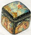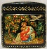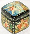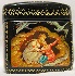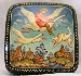 Description: This small square box was painted by the well-known Mstera artist Vladimir Moshkovich. It depicts several scenes from the Russian fairy-tale “Geese and Swans”. The lid shows the moment of the fairy-tale when the wicked birds Geese and Swans kidnapped the little boy by the order of Baba-Yaga. The sides of the box are covered with the following scenes: the River conceals Alyonushka and her little brother under her banks and Geese and Swans can't notice them; the Apple Tree hides the children under her branches and Geese and Swans fly past them; the Stove hides the children and the wicked birds can't find them; Alyonushka and her little brother successfully come back to their parents.