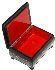 The box is made out of paper-mache. Black lacquer covers the exterior and red lacquer covers the interior of the box. The lid is hinged at the left, and the box rests on four legs. Signed and dated (1999) by the artist.
