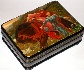"La Belle Dame Sans Merci" is a common theme depicted in many Victorian paintings of a woman using her beauty to entrap men, putting them at great peril. The scene is painted in the Neo-Classical style. Various shades of brown, green and red dominate here. Gold paint that details each tiny flower here is used to enhance life and brightness of the scene. The scene is framed with a nice pattern composed of gold beads. More complex gold floral ornamentation can be found wrapping around the box's sides. The box is made out of paper-mache. Black lacquer covers the exterior and red lacquer covers the interior of the box. The lid is hinged from the top of the scene, and the box rests on four legs. The box's exterior bottom is framed with a gold line; in the center of it the artist depicted in gold paints the flying bird carrying the ribbon; within this ribbon he wrote in English: the village of Palekh, his name, and the title of the original ("La Belle Dame Sans Merci"). At the bottom of the scene painted on the lid he wrote in Russian: Palekh, the title ("Beautiful Lady"), and his name all in gold paints.