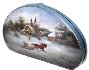 The landscape is painted in dark blue, gray and white tones of oils that successfully reflect the state of nature of the chosen season. To paint these two winter landscapes the artist has used two surfaces of the box. The box's exterior is covered with blue and gray lacquers whereas its interior is covered with red lacquer.Both pictures from both sides are framed with a gold lines.