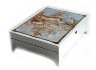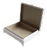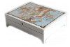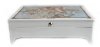 The box is constructed out of paper-mache. White creamy lacquer covers the exterior and light creamy brown lacquer covers the interior of the box. The intricate and complex gold line decoration is framing the composition. The box has a hinge to its top and rests on four legs, which are finished with metal nails. It is signed and titled ("The Royal Chess") by the artist.