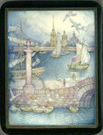 The box has pieces of mother-of-pearl inlays and that gives additional shinning to a box , especially in the skies and waters of Neva river.