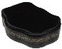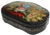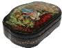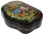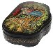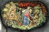 A waving gold line based on the golden dots acts as a frame for the scene; gold ornament can be also found wrapping around the bottom part of the box's sides. The box's interior is covered with red paint. The exterior is painted black.The box is signed with the artist's name, Kholui and title- Baba-Yaga.