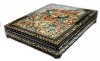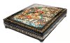 The box is constructed from quality paper-mache. Black lacquer covers the exterior and red lacquer covers the interior of the box. The box is hinged from the left of the scene, and rests on four legs.