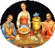 The scene shows a young beautiful woman, serving up a plateful of appetizing pies. Two men talk, drinking tea and eating tasty pies. Among kitchen utensils on the table we can see a bottle of wine. May be, a little later, after drinking some glasses of wine the depicted characters will begin singing a beautiful song. There is always something genuine and attractive when people sit together at one table and enjoy a snack and song.