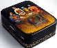 The miniature is neatly done and follows the traditions of old Fedoskino masters. The characters have their own personalities and facial expressions, showing various levels of emotion. The artist uses a palette with realistic browns, skin tones, and infusions of bright paints for emphasis. By fading the scene towards the edges of the composition, there is a spotlight effect on the characters and what is taking place. A beautiful inlay of gold and aluminum metallic powder lights up almost all elements of the composition and provides a nice enhancement to the work without overpowering the painting.