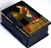 The box is constructed out of paper-mache made in the village of Fedoskino. Black lacquer covers the exterior and red lacquer covers the interior of the piece. The box has a hinge to its left and rests on a flat bottom. The interior also includes the Fedoskino