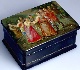 The artist uses a bright and expressive palette that reveals a wide range of colors and tones. Bright red, pink, yellow, brown and olive tones of the girls' costumes contrast beautifully with the green background of countryside. The faces of the characters reflect different emotions: joy, slyness, flirtation on the one hand, and interest, seriousness, indifference on the other hand. Their bright costumes are well drawn and adorned with intricate patterns. Aluminum powder enhances numerous areas within the scene. The costumes of the characters shine like precious gem stones. Trees, grass, bushes and the sky area glow gorgeously, lightening up the composition. Gold paint is used to highlight the grass in the foreground and some elements of clothing. Gold is also used to decorate the sides of the box with the elegant ornament.