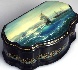 The artist achieves some very good textures here. The water looks strikingly realistic. She does a nice job with the highlights and shadows on the ship situated in the foreground, adding an almost photographic realism to this work. The forms in the distance are naturally less detailed, creating a sense of depth and conveying the effect of humidity in the atmosphere. In the distance, there are some grey clouds near the horizon; perhaps there is a faraway rainstorm. A gorgeously detailed ship and vivid blue color gives this box a splendid appearance. A very pretty scene!