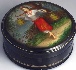 Description: This box has been painted by Fedoskino artist Tatyana Frolova. This traditional for Fedoskino School composition shows a Ukrainian woman with a Yoke. Its original was painted by the famous Russian artist I.I. Sokolov; and the same scene can be found in almost every catalogue on Fedoskino lacquer miniature painting, for example in the book "Lacquer Miniatures. Fedoskino" (by N. Krestovskaya. Interbook, Moscow. 1995), on pages 42-43. The depiction of Ukranian peasant life, during the Vishnyakov and Lukutin era, was extremely popular after the smashing success of Gogol's "Ukrainian Tales". In the 1860s V. Timm published I.I. Sokolov's drawings dealing with Ukrainian peasant life in his Russian Art Newspaper (Russky Khudozhestvenny Listok); and very soon the Ukrainian Woman theme borrowed from lithographs published in this newspaper became very popular among artists of the Moscow region. The composition showing a Ukrainian woman with a Yoke is often encountered in museum collections. The young girl, dressed in traditional Ukrainian costume, is depicted by a riverside on the outskirts of a village against a light silverish background. This delicate landscape creates a naively pure image, whose lyricism is akin to the generalizing symbols redolent of folk art.