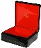 The box is constructed from paper-mache. Black lacquer is used to paint the exterior of the box while red lacquer completes the interior of the work. The edges of the lid and the sides of the box are decorated with intricate gold patterns. The lid is hinged from the top of the composition, and the box rests flat. The Fedoskino "troika" insignia can be found on the interior of the lid. The box is signed with the artist's name.