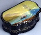 The composition painted on a small platform is framed with elegant gold patterns highlighted with blue oils. The sides of the box are adorned with more intricate gold patterns also highlighted with blue oils.