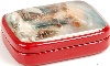 The scene is framed with a gold line. Red lacquer is used to cover both interior and exterior of the box. The lid is hinged from the left of the composition, and the box rests on a flat bottom. The work is signed with the artist's name, the village of Fedoskino, and the year of 2005.,br>