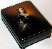 The portrait is framed with a gold line. Two parallel lines wrap around the box's sides.