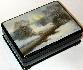 Description: This gorgeous box by S. Parmeonov of Fedoskino depicts the clarity and beauty of a winter day. The scene depicts a frozen, icy river and the surrounding landscape filled with trees and snowdrifts. The landscape is lyrical and romantic. Snow-covered trees, with delicate lace-like branches, rolling hills covered with thick snow create a harmonious image. The scene is painted mostly in white and gray-bluish tones, which in the best way possible can help to reproduce the atmosphere of a winter day. The palette is soft and cool, and you can almost feel the chilly air. The artist does a nice job creating the look of snow on the trees, and the reflection of the bank on the icy river. Mother-of-pearl creates the depth of the sky and the brilliance of sunrays fighting through dense gray clouds. The snow looks very soft, as if it were untouched all winter. Breathtaking landscape!