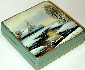 The box is constructed from paper-mache. A hinge is fastened to the top of the composition. The box rests on four legs. The work is signed by the artist at the bottom of the composition.