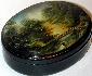 Description: This beautiful oval box was painted by an expert of this genre, Dunaev, from the village of Fedoskino. It features the state of nature before the storm. The ominous clouds in the sky creep slowly ready to engulf it in rain. The scanty sunlight that struggles through the dense clouds is reflected in the water of the river. Trees, bushes and grass bend before the wind. In the morning, or whenever the storm decides to pass, the sky will be clear, the birds will be singing, and the land will feel alive once again.