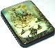 Description: This dramatic winter landscape has been painted by Dunaev from the village of Fedoskino. The bell tower and several cathedrals rise above the small wooden peasant houses covered with white snow. The sunset paints the dark evening sky with a warm golden glow. This visual effect is achieved with the help of gold metal powder. Mother-of-pearl is inlaid in the portion of the bell tower and some of the cathedrals. The fir painted on the left creates balance and depth of the scene.
