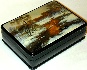Description: Parmenov from the village of Fedoskino painted this dramatic winter landscape. The winter sunset paints the sky with a bright golden glow. The icy surface of the frozen river reflects the golden sunlight creating a very beautiful visual effect.
