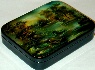 Description: The talented Dunaev from the village of Fedoskino created this peaceful summer landscape. The bank of the forest lake is overgrown with fresh greenery. The small boat is left on the bank by a fisherman. Mother-of-pearl shines through the portion of the sky decorating and enlivening the composition.