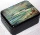 The box is constructed from paper-mache. Black lacquer is used to paint the exterior of the box while red lacquer completes the interior of the work. The lid is hinged at the top, and the box rests on a flat bottom. Signed and dated (2006) by Dunaev. This well-done seascape has a classic, timeless quality.