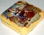 The scene is set into the irregular square with wavy edges outlined with gold paint; it has been done to create the illusion of the curtains. The box's exterior is covered with yellow-cream paints; its interior is dark red. On the box's exterior bottom the artist has painted in gold paints two masks