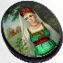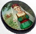 Description: This classic Fedoskino box is painted by Smirnova V. The young beautiful girl dressed in the Russian traditional costume stands meditatively under a big tree. Her figure painted in soft tones stands out against the greenery of Russian countryside. The small wooden church painted in the background creates the depth of the composition. Aluminum powder used as an underlayer for her sarafan creates luxuriant satin texture. Gold metal leaf shines through the embroidered ribbons that decorate her sarafan and kokoshnik (