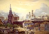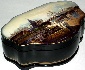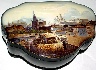 This wonderful box has been painted by Fedoskino artist A. Gaiduk. It shows a bird's-eye view of the Moscow Kremlin. White-stoned, golden domed cathedrals and red-bricked towers rise above the roofs of small stoned houses situated outside the Moscow Kremlin's wall. Tiny people walk along the street leading to the Kremlin, this creates a sense of natural scale. This is a panorama of pre-revolutionary Moscow as the names of the shops are written with the type that doesn't exist in modern Russian language, and the depicted street is too desolate for present-day Moscow with its heavy traffic.