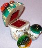 Description: This charming work that looks more a statuette than a box has been created by Fedoskino artist Karina Kirsilyan. It continues the series of works made in the shape of different kinds of mushrooms. This time Karina has chosen to reproduce the big green capped "russule" mushroom, accompanied by two 'russule' mushrooms of a smaller size. The big mushroom's cap was partly eaten by worms. The work is supplemented with three-dimensional elements; the most laboriously done of them is a branch of the rowan tree covered with red bright berries and green-orange leaves. The top section of the big mushroom (its cap) opens on a hinge to reveal a small square compartment.