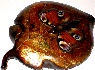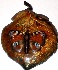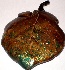 This interesting work is a creation of Mirochnichenko, a talented artist from the village of Fedoskino. It repeats the shape of a faded autumn orange-brownish leaf. Oil paints cover the whole surface of the box except its interior. In some areas the oils are mixed with bright gold dust. Gold metal leaf shines through the oils on the front and bottom sides of the box. The beautiful butterfly crafted tree-dimensionally, and glued on the front side is a zest of the work. The box has a small lid hinged d at the base of leaf; it opens to reveal a small square compartment.
