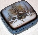 The decoration of the box's exterior pays a special attention. The edges of the lid seem to be sprinkled with dark gray paint; and this serves as a frame for the depicted scene. The box's sides are adorned with tiny thin gray veins scattered against the light blue background; the box's exterior bottom is decorated with tiny thin blue veins scattered against the dark gray background. The interior is traditionally red. The box's sides are also adorned with so called "scan patterns" composed of tiny shapes hand punched from silver metal sheets and then painstakingly affixed by hand to the box.