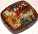 Various shades of brown dominate here as the action takes place inside the wooden peasant house. Gold metal leaf shines through the boy's shirt, the blanket, the kettle and small doors on the stove. Mother-of-pearl is set into the window, the boy's trousers, and the blanket.