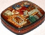 Description: This charming small box is a creation of Novoseltseva from the village of Fedoskino. It depicts the boy lying on the stove, and playing with the kitten. The interior of the peasant's house is skillfully drawn with a lot of details. It gives a possibility to acquaint oneself with a family life of Russian village. The stove is paved with tiles; each tile features a definite geometrical image. Inside the stove there is a cooking pot; peasant food cooked inside the stove is very delicious and good for health. A stove in a Russian village is the center of the house; it is used for generating warmth, for cooking, and also, as it is shown here, Russian peasants like to lie on the stove. From the right of the stove there are two barrels filled with water, and the kettle hung on the wall; they are used as simple appliances for washing. The blanket the boy lies on is made out of multicolored rags. Onions and healing herbs are hung on the walls.