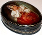Alexander Zayakin from the village of Fedoskino painted this splendid reproduction of the famous oil-on-canvas painting "By the Stove" painted by the Russian artist Konstantin Makovskiy (1839-1915). This scene is very popular among Fedoskino artists, but the first version of this painting was created by Nikolay Soloninkin.