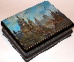 The scene is painted in blue and dark green oils. Gold paint is used for highlighting but in very minimal amounts. Gold is also used to paint a line that frames the scene, and two gold parallel lines that wrap around the box's sides.