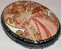 Description: This oval box is a creation of Skripunova from the village of Fedoskino. This artist has a peculiar painting style, and it's always easy to recognize her attractive boxes.