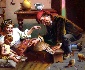Description: This idyllic scene has been painted by E. Marochkina from the village of Fedoskino. Here we can see the happy family feeding a hen. Tender emotions are reflected on their faces. It's very hard to reproduce people's feelings painting with an ultra-fine brush. The interior of the room is filled with a lot of brilliantly painted details including the jars, the fire-place with the burning fire inside, various kitchen utensils hanging on the walls that make the composition complex and complete.