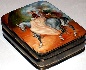 Description: This marvelous box is a creation of E. Mishina from the village of Fedoskino. It shows the elegant lady and her suitor riding in the park. The scene is painted in the realistic style, with keen attention to detail and a masterful illusion of light and shadow. The faces of the characters are precisely painted; the horses are drawn with attention to correctly portraying their anatomical features. Mother-of-pearl is set into the sky to fill the scene with light and splendor.