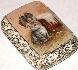 This charming small box is a creation of Mishin from the village of Fedoskino. It shows a humorous scene-a little kitten looks dreamily at fish, and certainly, soon one of the fish will be tasted by this funny naughty animal. The box is made out of high quality paper-mache. The lid is hinged at the left, and the box rests on a flat bottom. Signed with the artist's name, the village of Fedoskino, and the year of 2007. The Fedoskino "troika" insignia can be found on the interior of the lid.