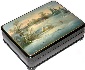 The box is made out of paper-mache. Black lacquer covers the exterior and red lacquer covers the interior of the box. The box has a hinge above the scene, and rests on four legs. Signed with the name of the artist, Fedoskino, and the year of 2005.