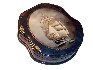 The box's exterior imitates coloring of a stone (light blue veins are scattered against the dark blue background) while the interior is traditionally red. The lid and the sides are adorned with intricate gold ornaments.