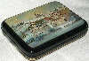 The box is constructed out of paper-mache. Black lacquer covers the exterior and red lacquer covers the interior of the box. The lid is hinged from the top of the composition, and the box rests on a flat bottom. The work is signed with the artist's name, Fedoskino and the year of 2008.