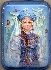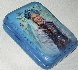 This beautiful small box has been painted by Taisia Danchenko. It shows the Snowmaiden drawn against a background of the winter forest. The scene is painted in blue tones of oils. Silver paint used as an underlayer for the oils, shines magically through the Snowmaiden's sarafan and kokoshnik. A simple pattern composed of silver punch-outs (silver scan pattern) decorates the edges of the lid. The box's exterior is of beautiful blue tone, and covered with silver dust and dark blue blurry spots and veins to imitate a stone color. Its interior is traditionally covered with red lacquer.