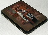The box is constructed from paper-mache. Black lacquer is used to paint the exterior of the box while red lacquer completes the interior of the work. The lid is hinged from the left of the portrait, and the box rests on a flat bottom. The work is signed with the artist's name.